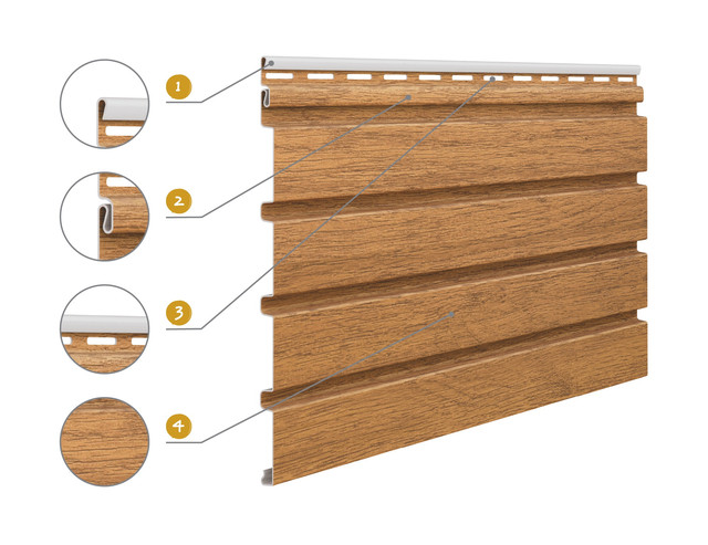 - рифлення на структурі імітують деревину і одночасно дозволяють вільно стікати воді, зменшуючи накопичення пилу на поверхні фасаду